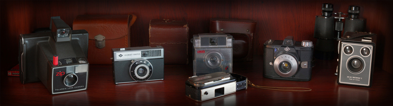 A stiched (from 4 photo’s) panorama picture of my collection of retro camera’s.
