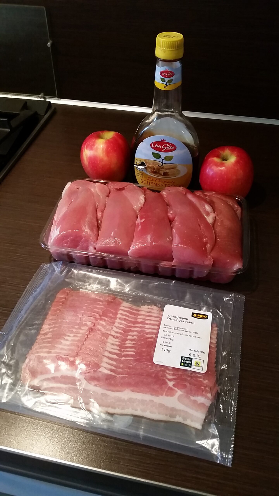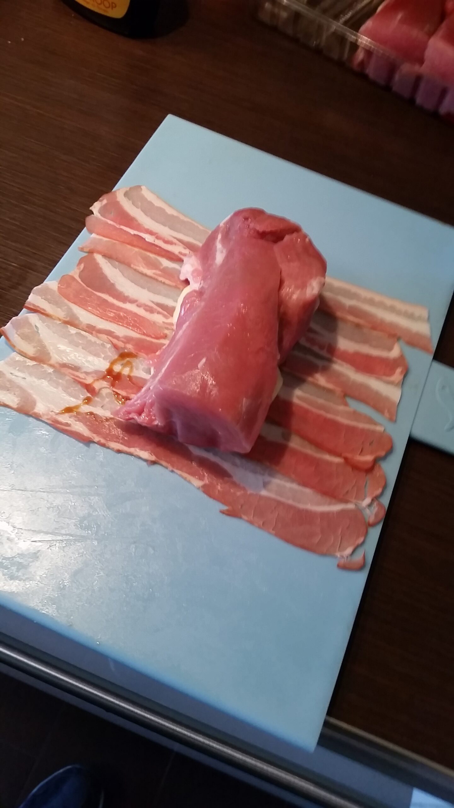- Pork tenderloin with apple and syrup wrapped in bacon